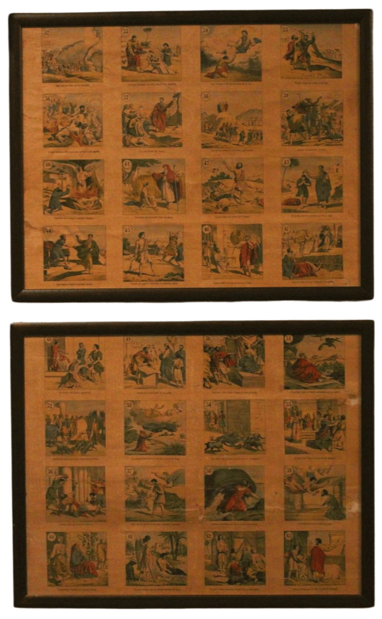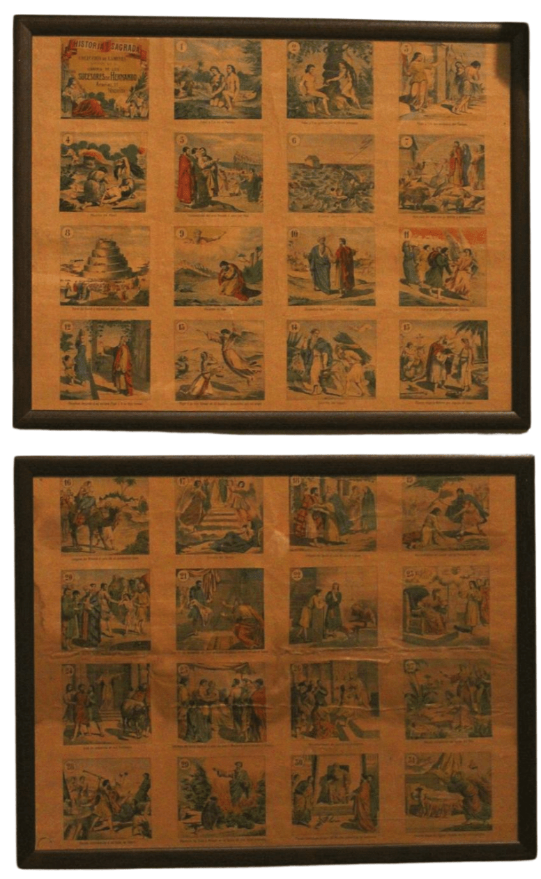 Por su parte, la sala de Arte Sacro cuenta con cuatro láminas dedicadas a la Historia Sagrada. Enmarcadas y trabajadas en papel sobre tela de lienzo, a todo color, se dividen en 16 viñetas cada una, con pasajes del Antiguo Testamento. Fueron publicadas por Sucesores de Hernando y donadas por Mari Cruz Villalón.