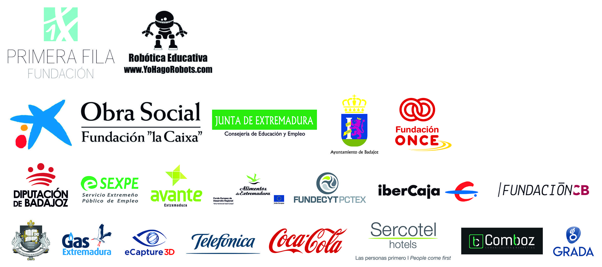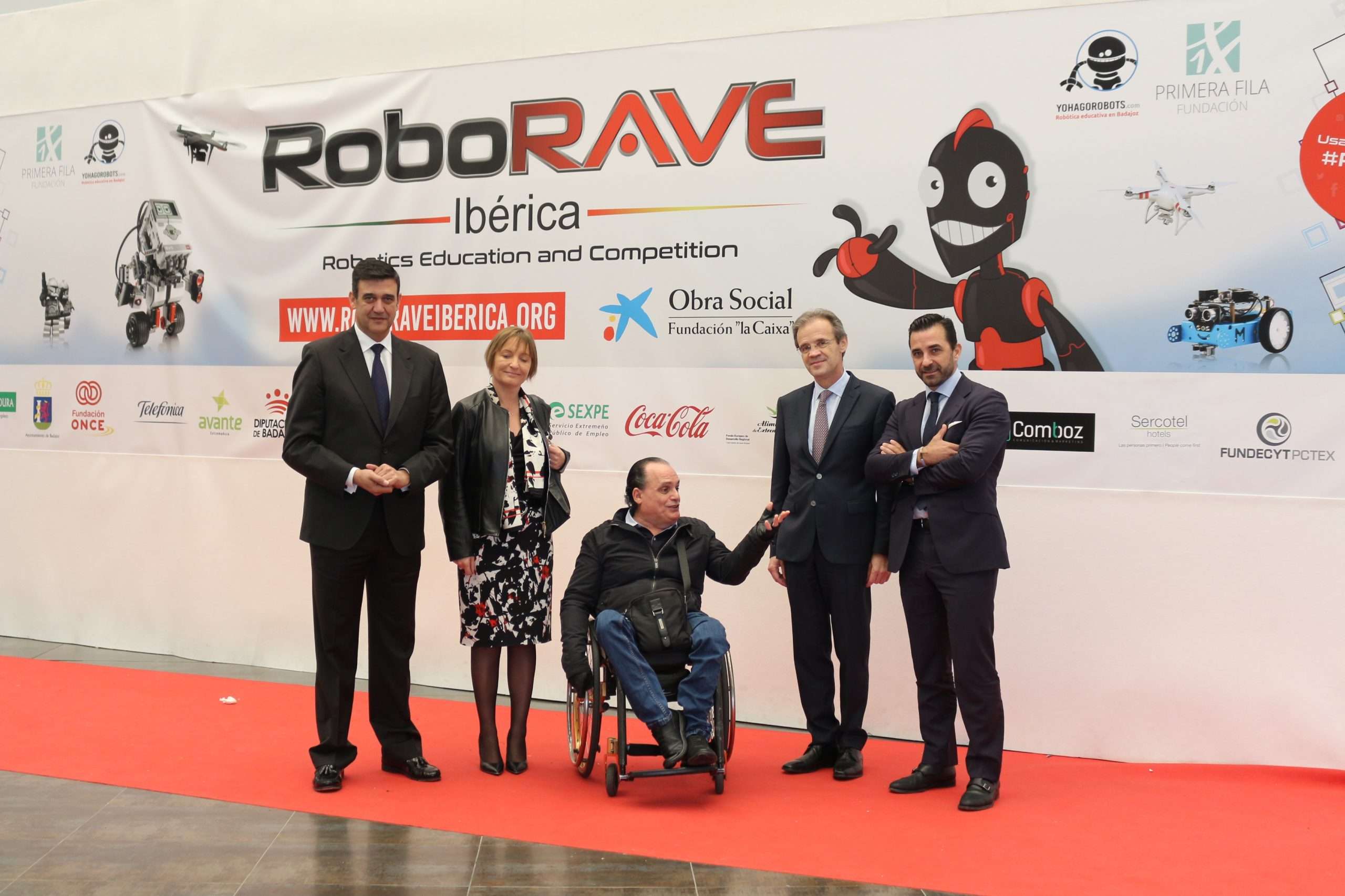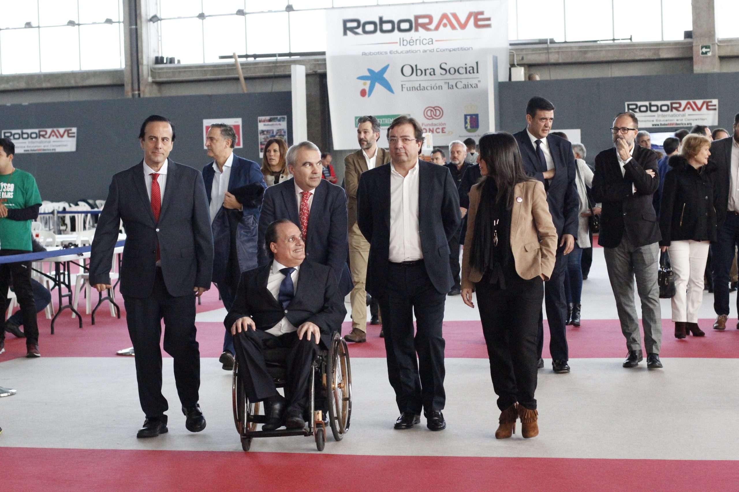 El presidente de la Junta de Extremadura, Guillermo Fernández Vara; la consejera de Educación y Empleo, Esther Gutiérrez; el alcalde de Badajoz, Francisco Javier Fragoso; el director comercial en Extremadura de CaixaBank, Pedro Zarco; y el presidente de la Fundación Primera Fila, José Antonio Lagar, como entidad organizadora del evento junto a la Asociación de Robótica Educativa de Badajoz, inauguraron el evento ante multitud de medios de comunicación.