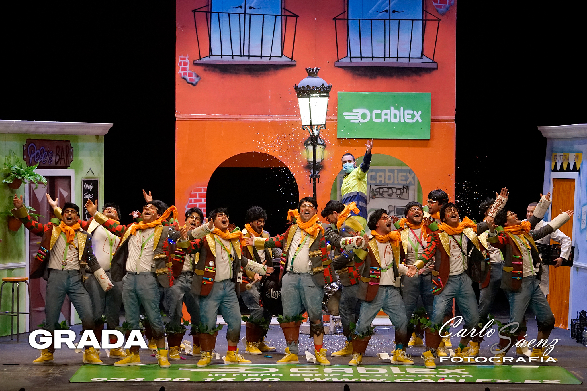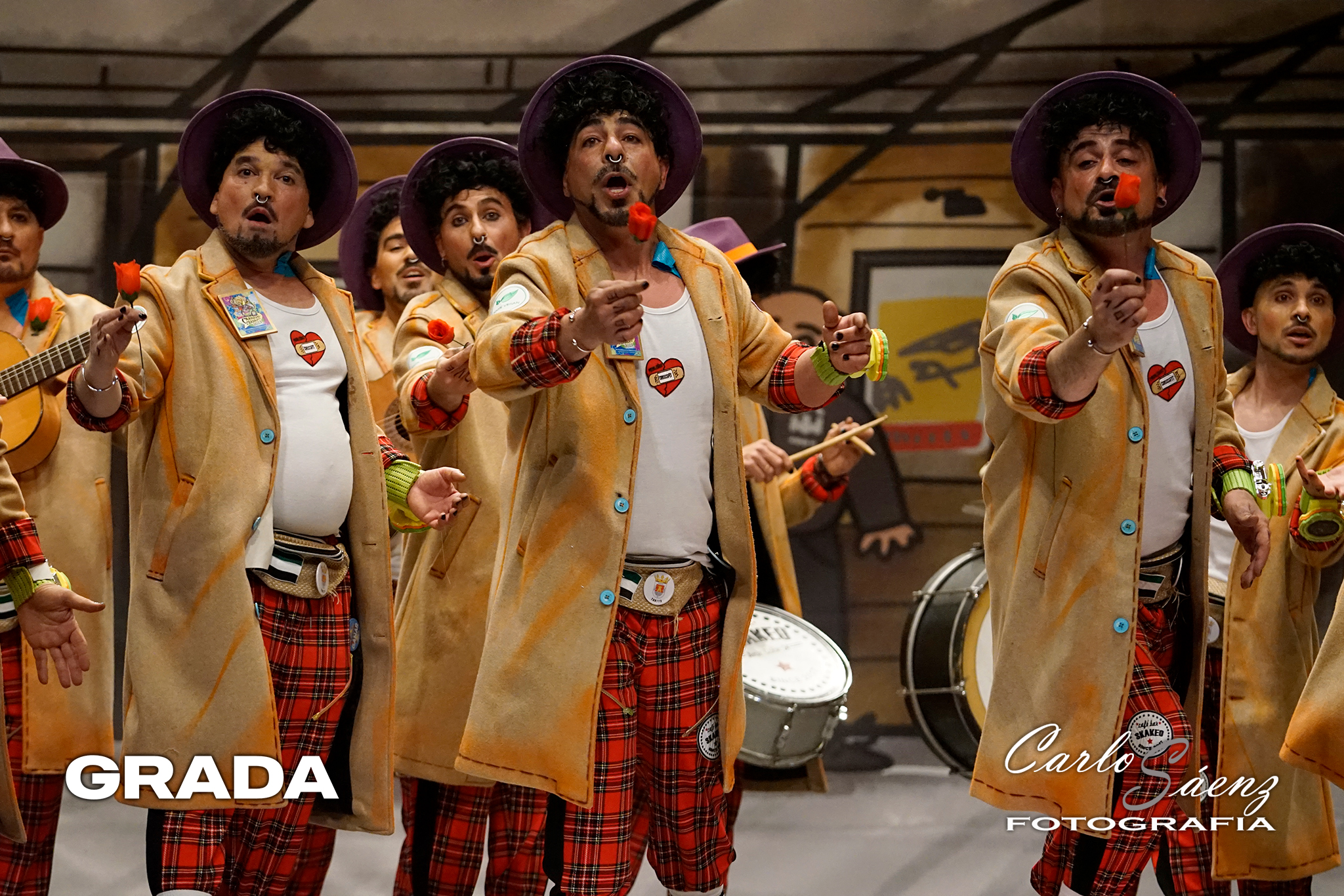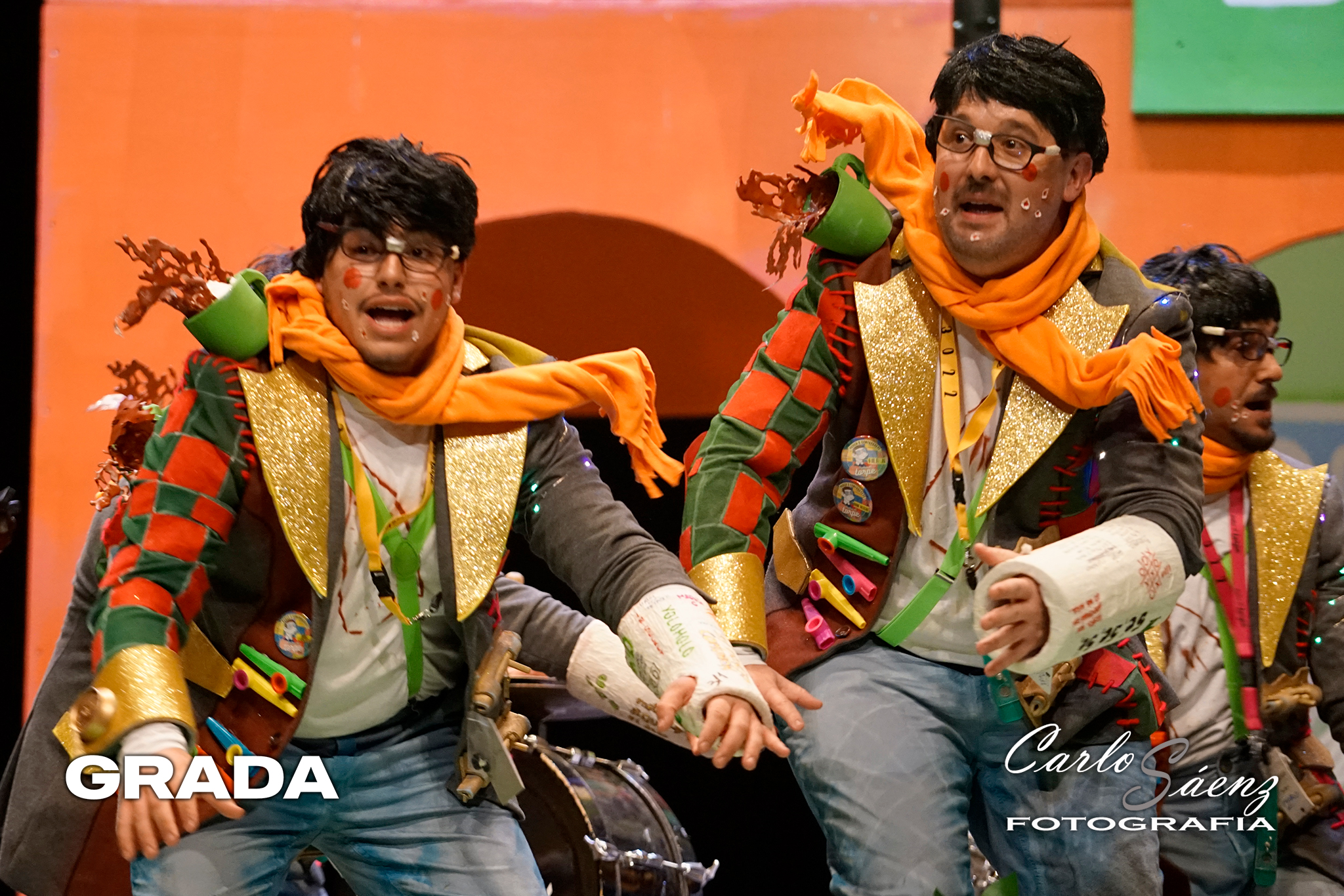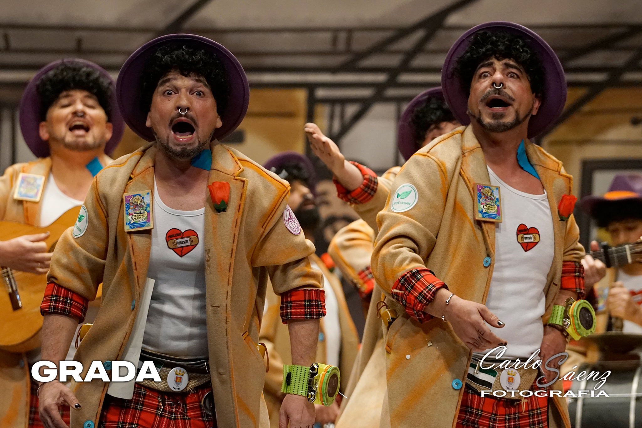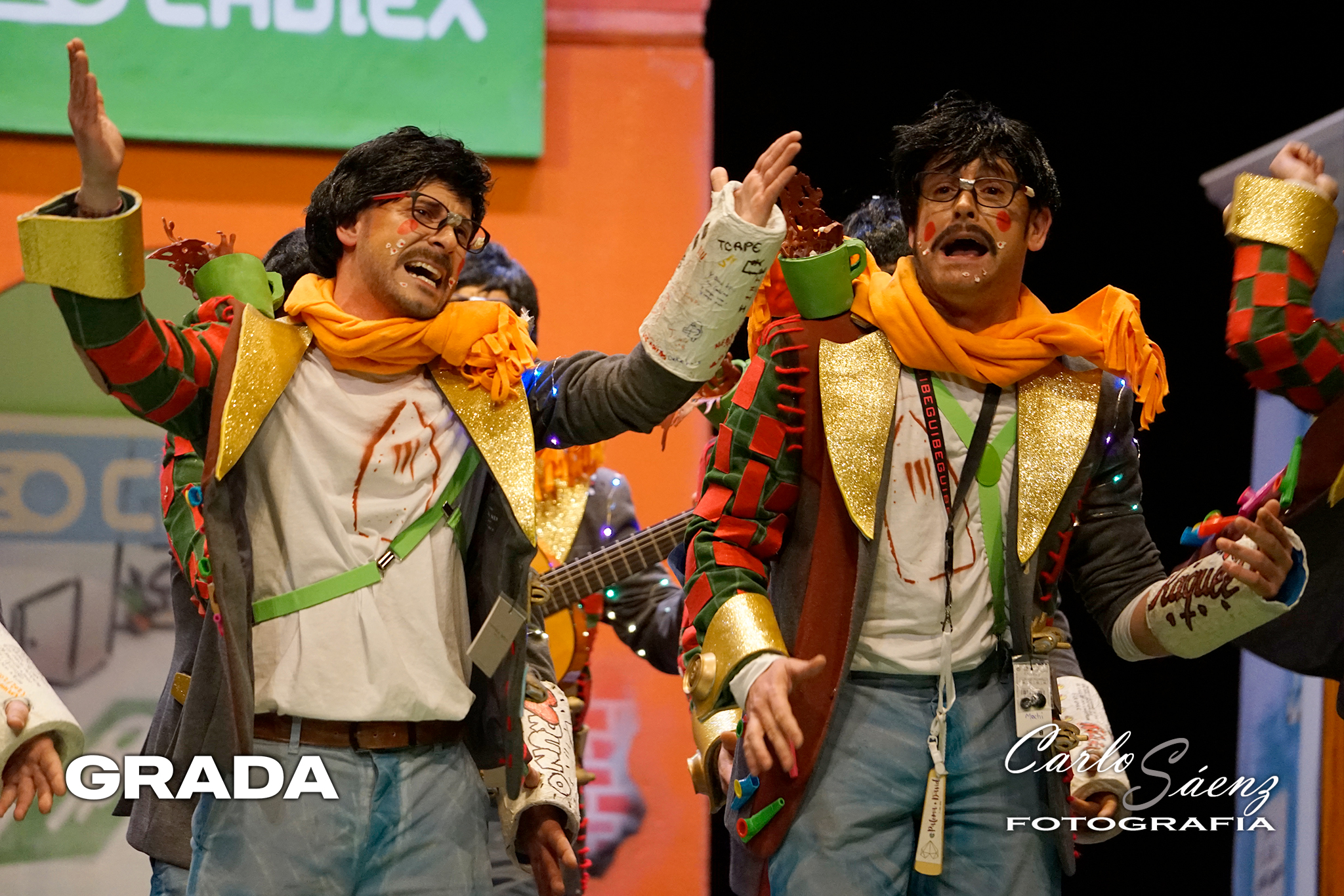 Uno de los platos fuertes de la jornada. A Contragolpe es una agrupación sólida, con recorrido y trayectoria ascendente y, aunque en los últimos años no han conseguido los resultados que esperaban, suelen caer muy bien y es una murga que siempre se le espera con deseo. Este año nos presentan a Pedro el Torpe al que solo hay que mirarle el disfraz para entender el concepto. Un gran ejemplo de cómo una idea sencilla puede convertirse en una gran actuación. Muy inteligente el primer pasodoble arrancando desde el tipo para hablar de un gran problema como el trato de los bancos a los mayores con problemas de acceso a la tecnología. La actuación está llena de detalles de torpeza muy interesantes y el momento de la procesión en el popurrí será recordado. Dicen que son torpes pero después de ver su pase en preliminares creemos que no lo son tanto… ¡Hay Pedro para rato!