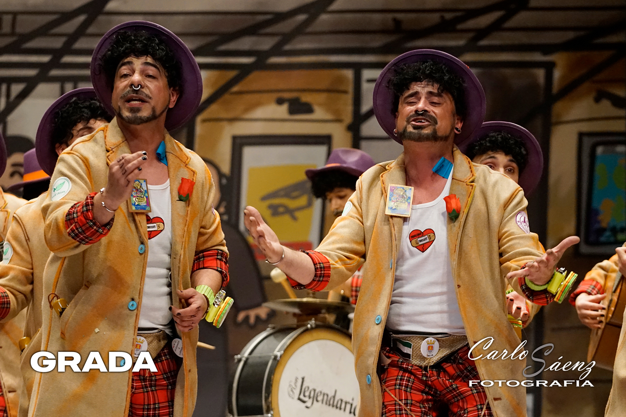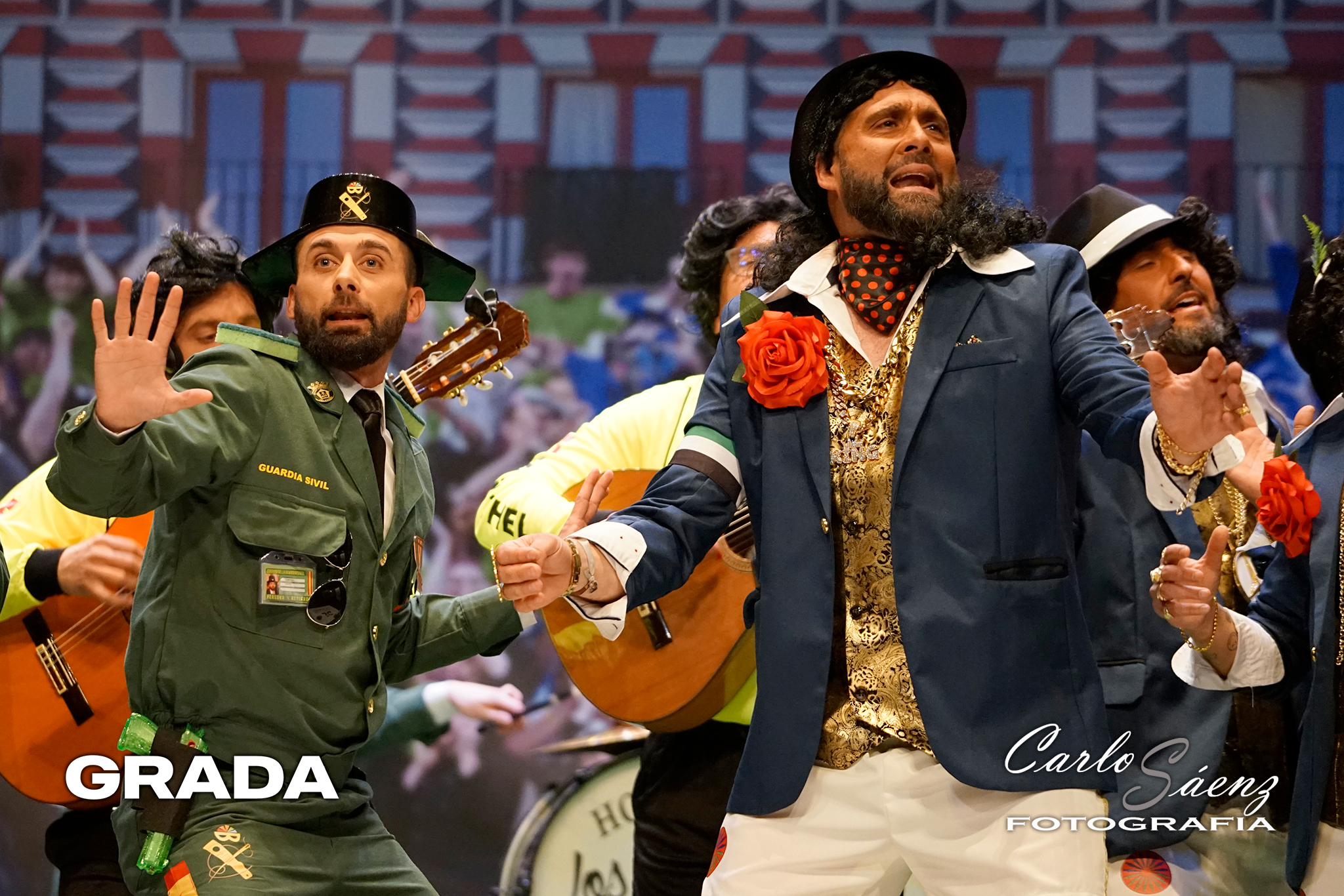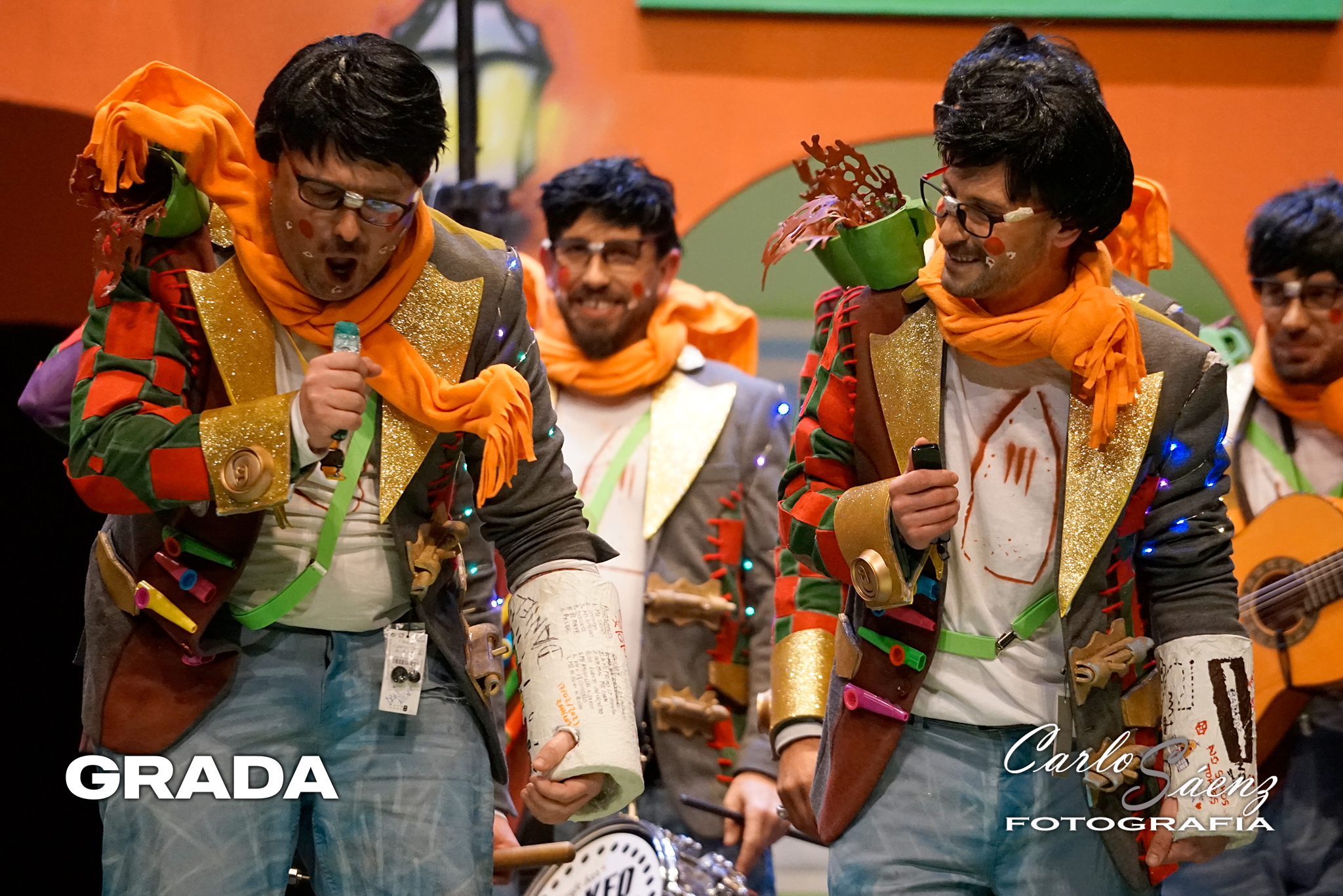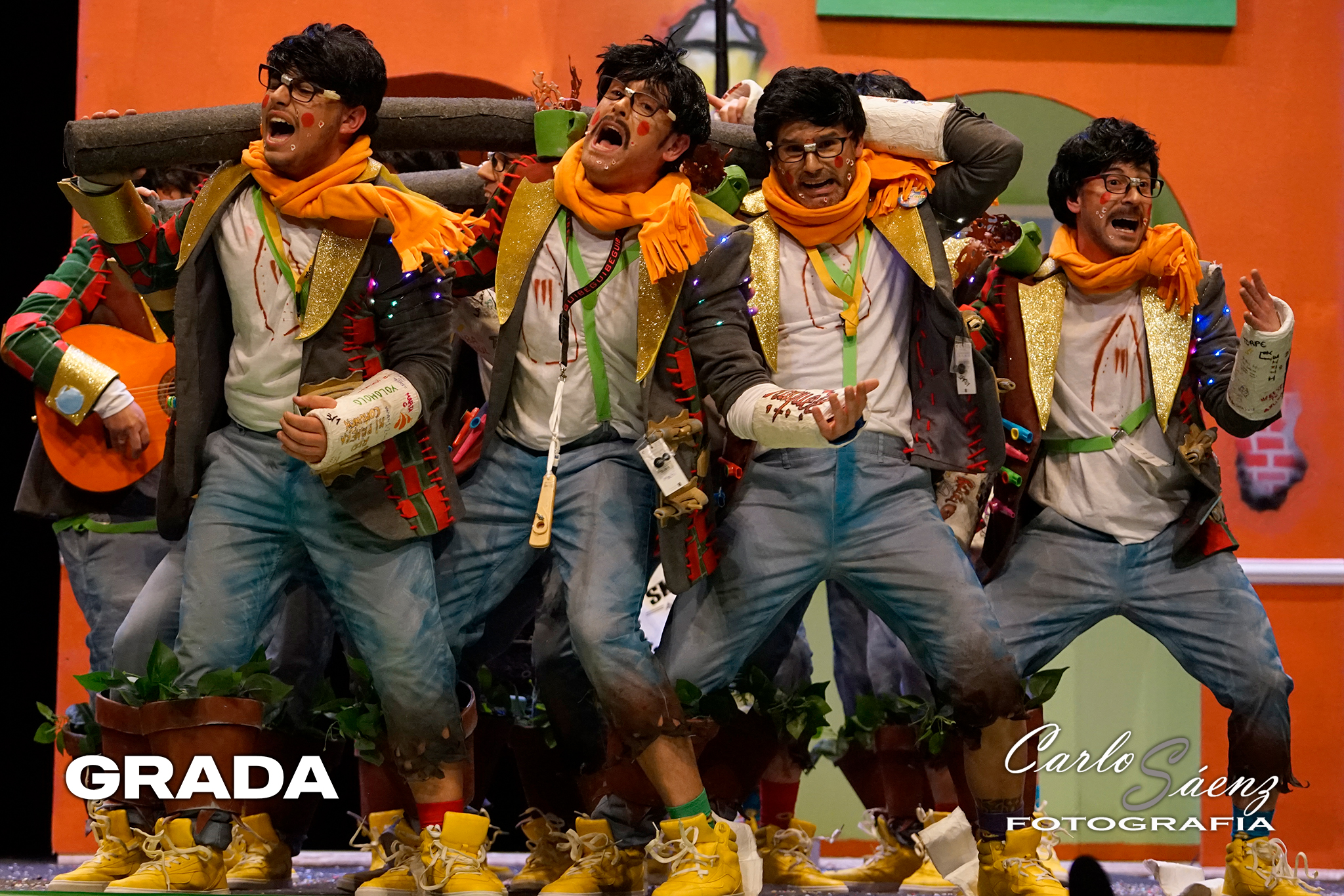 Uno de los platos fuertes de la jornada. A Contragolpe es una agrupación sólida, con recorrido y trayectoria ascendente y, aunque en los últimos años no han conseguido los resultados que esperaban, suelen caer muy bien y es una murga que siempre se le espera con deseo. Este año nos presentan a Pedro el Torpe al que solo hay que mirarle el disfraz para entender el concepto. Un gran ejemplo de cómo una idea sencilla puede convertirse en una gran actuación. Muy inteligente el primer pasodoble arrancando desde el tipo para hablar de un gran problema como el trato de los bancos a los mayores con problemas de acceso a la tecnología. La actuación está llena de detalles de torpeza muy interesantes y el momento de la procesión en el popurrí será recordado. Dicen que son torpes pero después de ver su pase en preliminares creemos que no lo son tanto… ¡Hay Pedro para rato!