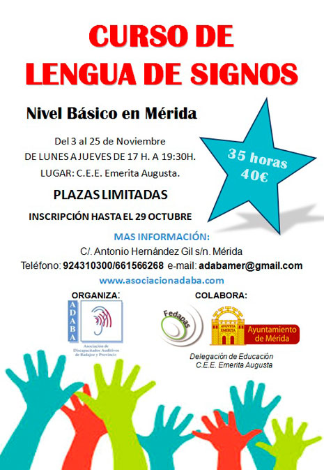 La Asociación de discapacitados auditivos de Badajoz y provincia (Adaba) organiza en Mérida un curso de lengua de signos de 35 horas de duración del 3 al 25 de noviembre.