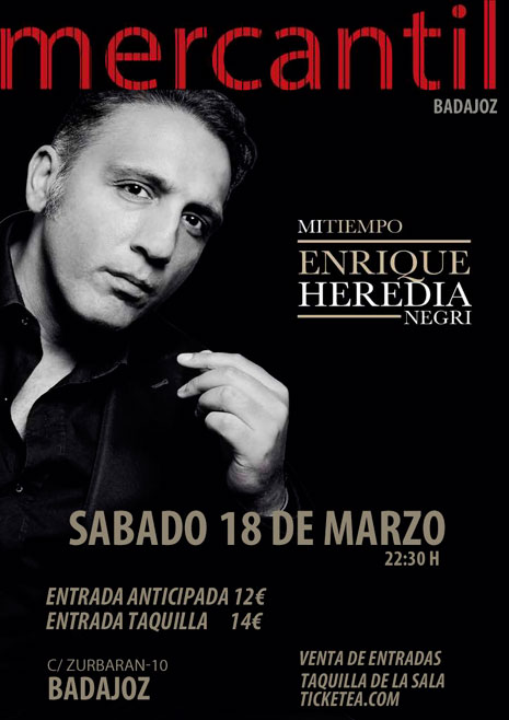 La Sala Mercantil de Badajoz acoge el sábado 18 de marzo el concierto de presentación del primer disco en solitario de Enrique Heredia, ‘Negri’. Las entradas se pueden adquirir en venta anticipada en la taquilla del Mercantil y en ticketea.com, con un precio de 12 euros.