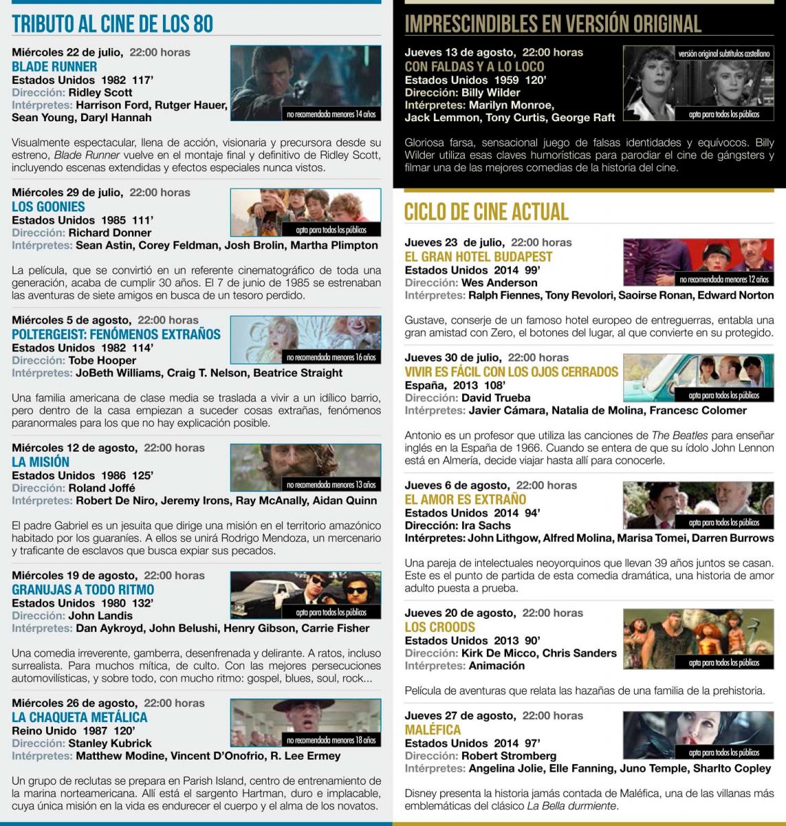 Un total de 12 películas se expondrán en en la terraza que cuenta con un aforo de 450 personas, conviertiéndose en un imprescindible de las noches de verano pacense y ampliando este año su programación para poder atender toda la demanda que hay alrededor de la actividad. El precio de las entradas es de 1 euro y podrán adquirirse los días de proyección de 19.00 a 22.00 horas.
