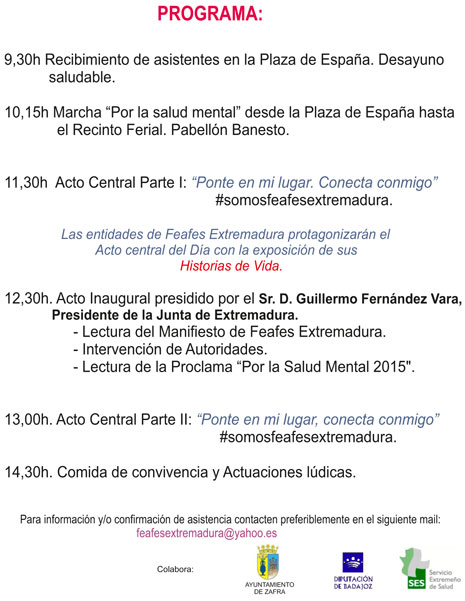Con motivo del Día Mundial de la Salud mental organiza mañana martes en Zafra una serie de actividades, entre ellas un desayuno saludable, una marcha por la ciudad, una comida de convivencia y diversas actuaciones lúdicas.