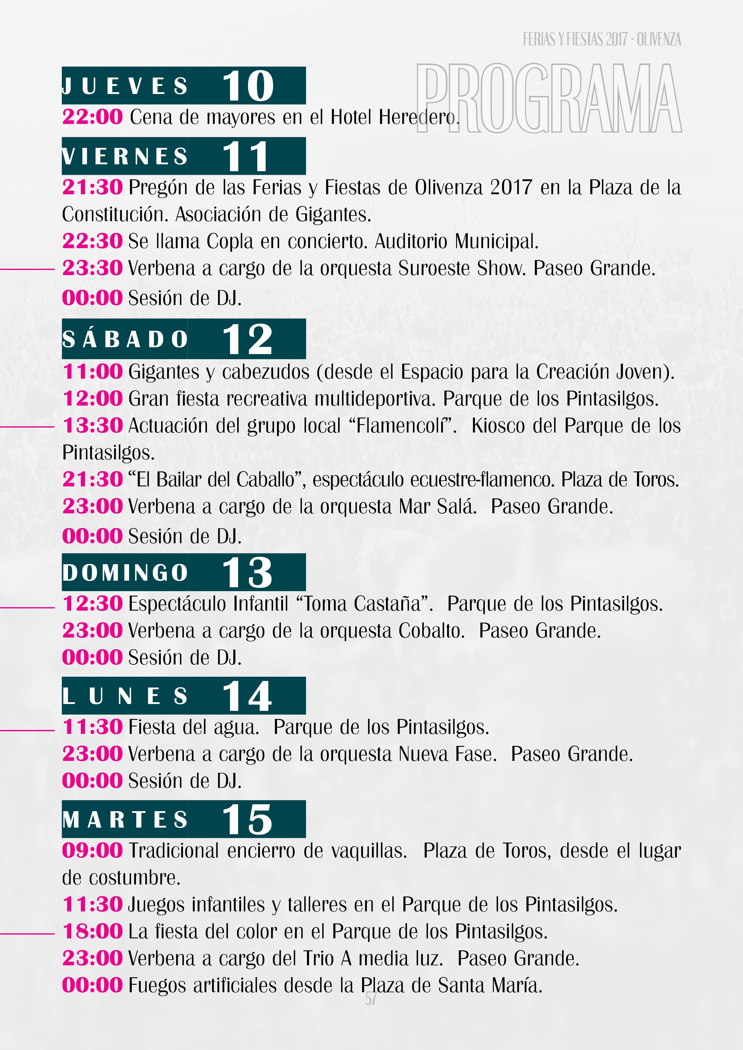 Verbenas en la Plaza de España (Paseo Grande) a cargo de las orquestas Suroeste Show, Mar Salá, Cobalto, Nueva Fase y el Trio A media luz; el espectáculo ‘Se llama Copla’ y sesiones de Dj en el Recinto Ferial, llenarán de música las noches de las Ferias y Fiestas de Olivenza.