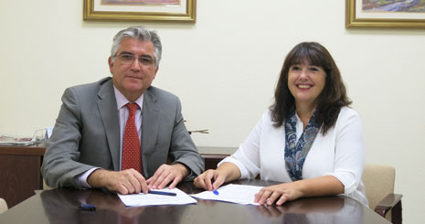 Virtudes Carrasco Fuentes, presidenta de ADMO, y Emilio Jiménez Labrador, director general de la Fundación CB, han rubricado este proyecto que tiene por objeto mejorar las condiciones de los niños enfermos de leucemia y otras patologías de la sangre durante su estancia hospitalaria.
