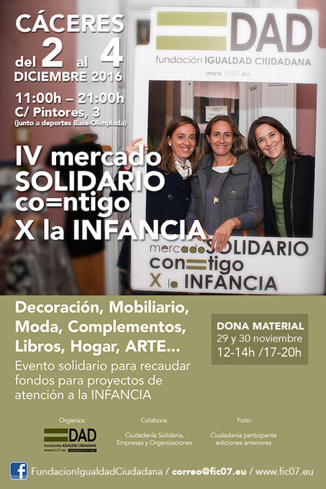 La Fundación Igualdad Ciudadana invita a participar en la cuarta edición del ‘Mercado solidario co=ntigo X la infancia’ que se va celebrar en Cáceres del 2 al 4 de diciembre en la calle Pintores número 3 de 11,00 a 21,00 horas para recaudar fondos para proyectos de atención a la infancia.