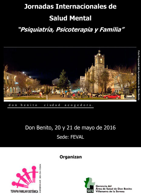 Las ‘Jornadas Internacionales de Salud Mental: Psiquiatría, Psicoterapia y Familia’, están organizadas por la Asociación Extremeña de Terapia Familiar Sistémica y la Gerencia del Area de Salud Don Benito-Villanueva de la Serena.