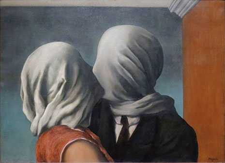 Centrándome en los protagonistas de este singular lienzo lo que más llama la atención es que sus identidades son secretas. Se supone que son un hombre y una mujer por sus vestimentas, aunque es aventurado pronosticar que son pareja porque se estén besando. Telas blancas y húmedas cubren sus cabezas. Este hecho de ocultar los rostros puede restar de erotismo y sensualidad a la obra, o quizás le puede añadir un plus de morbosidad, juzguen ustedes. No todos los amantes se profesan amor ni todos los besos son alusivos al amor.