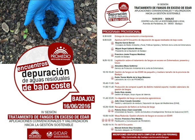 El IV Encuentro de aguas residuales de bajo coste, organizado por el Consorcio de Gestión Medioambiental de la Diputación de Badajoz, Promedio, analizará el jueves 16 de junio en Badajoz la gestión sostenible de los fangos resultantes del proceso de depuración de aguas residuales. El objetivo es promover la innovación y la investigación en el ámbito los residuos generados en una estación de tratamiento, con propuestas innovadoras que contribuirán a mejorar el tratamiento de estos materiales.