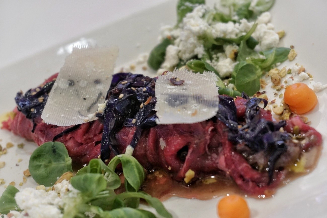 “Hemos elaborado un tipo de carpaccio relleno de un guiso de rabo de toro para dar importancia al vino, decorado con una tierra de aceite de oliva, un poquito de lombarda salteada con ajito y soja y parmesano”.