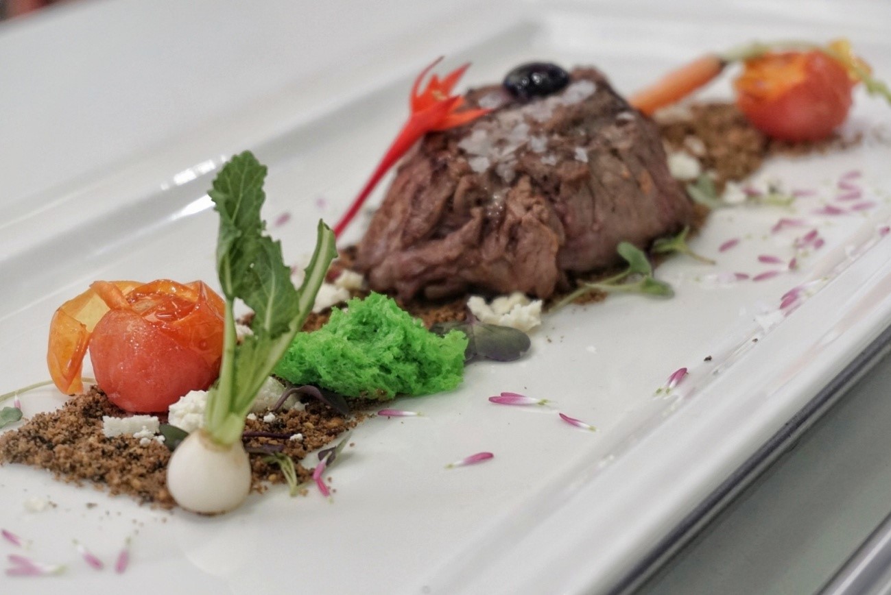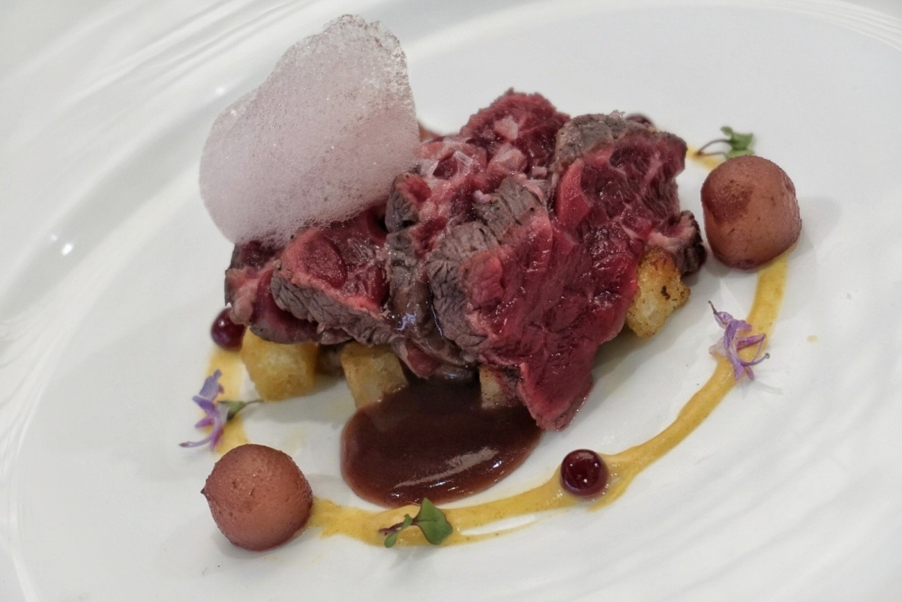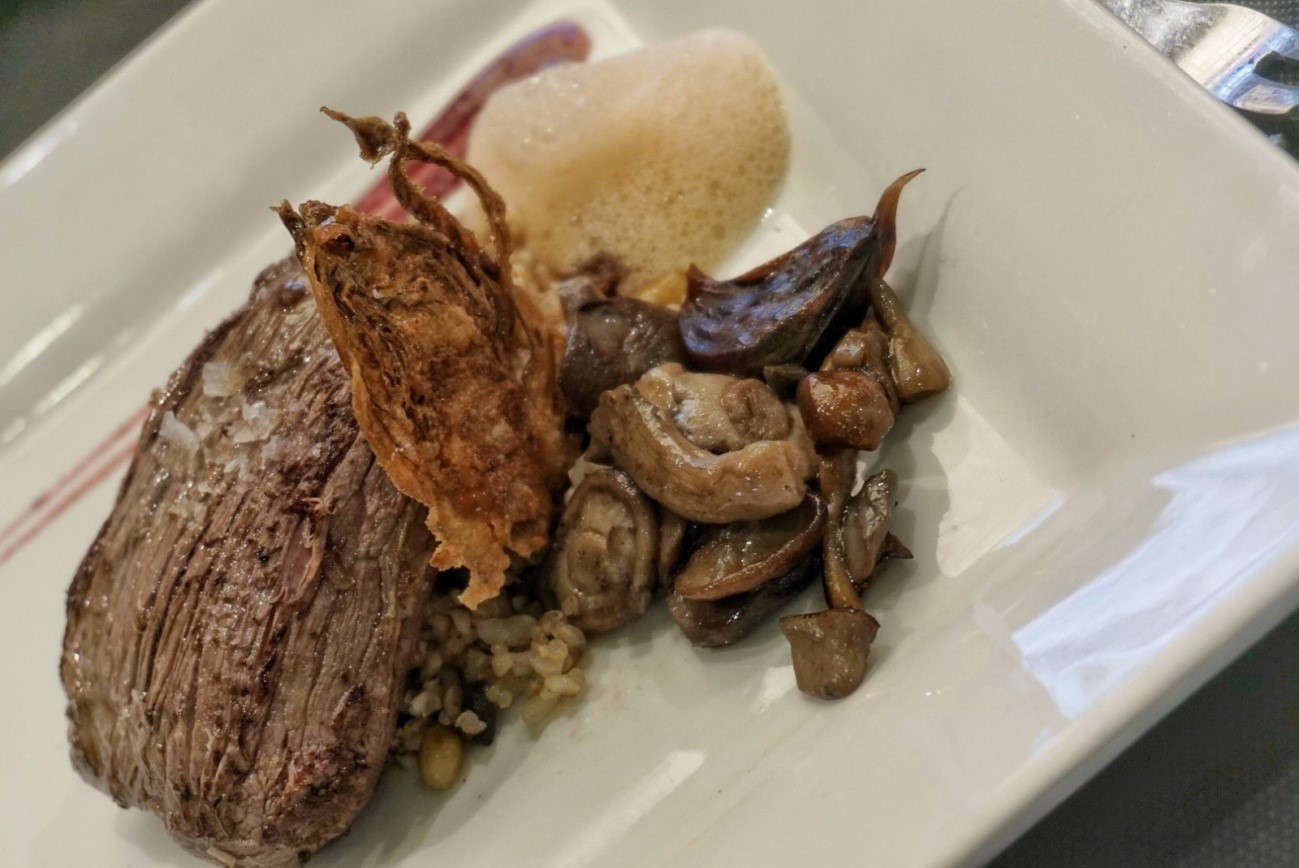 “Hemos fileteado el solomillo y lo hemos macerado con cebolla bien picada y vino tinto durante unos 90 minutos. Hemos realizado un crujiente de hinojo, unas setas salteadas con ajo negro, una mezcla de grano que se llaman bulgur, quinoa y arroz integral y por último hemos hecho un aire de frutas de hueso de las Vegas del Guadiana con ginebra y una salsa de cerezas del Valle del Jerte”.