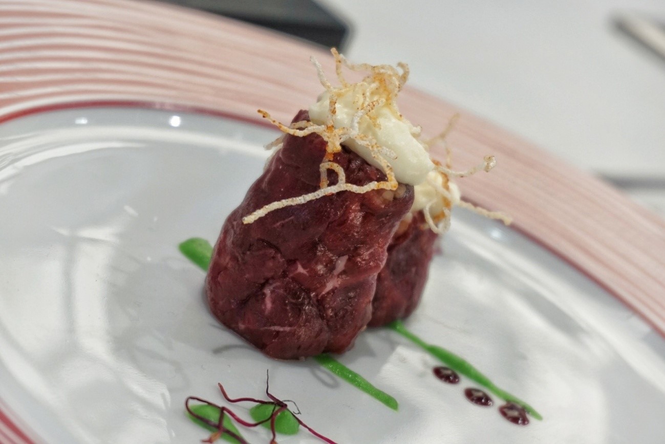 “Hemos fileteado el solomillo y lo hemos macerado con cebolla bien picada y vino tinto durante unos 90 minutos. Hemos realizado un crujiente de hinojo, unas setas salteadas con ajo negro, una mezcla de grano que se llaman bulgur, quinoa y arroz integral y por último hemos hecho un aire de frutas de hueso de las Vegas del Guadiana con ginebra y una salsa de cerezas del Valle del Jerte”, ha explicado el ganador en el momento de presentar su plato.