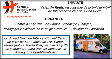 Por su parte, la Unidad Móvil de Intervención estará estacionada durante los días 25 y 26 de septiembre en Puerta Pilar. Esta unidad, cuyo responsable es Valentín Rodil, docente del Centro de Humanización de la Salud, pertenece al Centro de Escucha San Camilo de Tres Cantos (Madrid) y realiza visitas por toda España para ofrecer gratuitamente su escucha a las personas que estén sufriendo por la pérdida de un ser querido, que padezcan enfermedades que cursen con dolor, que sean cuidadores de enfermos crónicos o de ancianos, que hayan sufrido una ruptura familiar, que tengan problemas de relación, que estén ante un dilema ético, o que no le encuentren sentido a la vida.